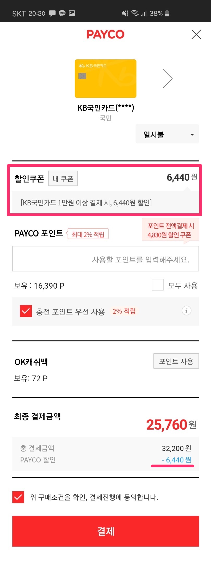 위에서 받아두었던 국민카드 20% 할인쿠폰을 사용하여 6,440원을 할인받습니다!! 🤑