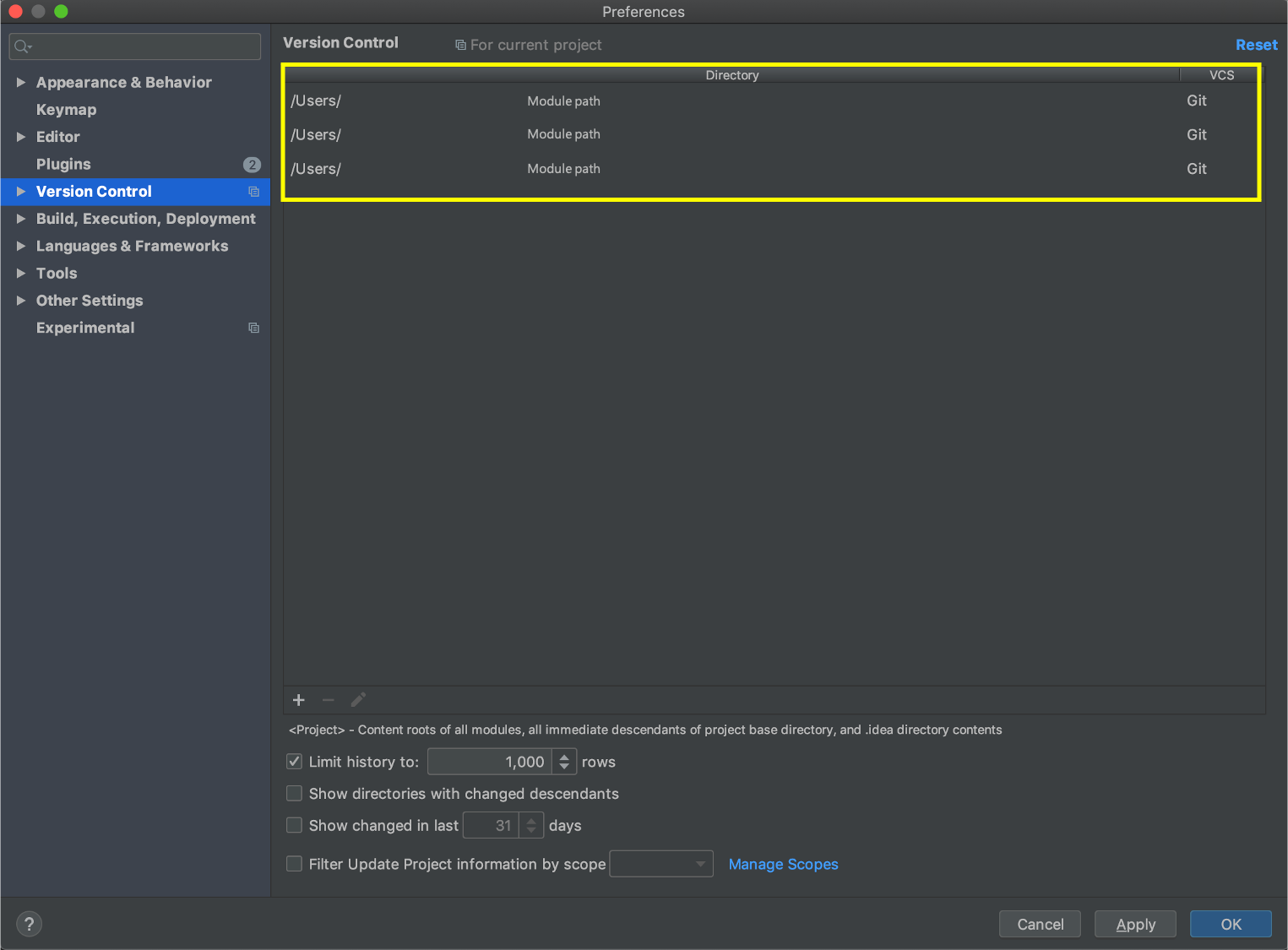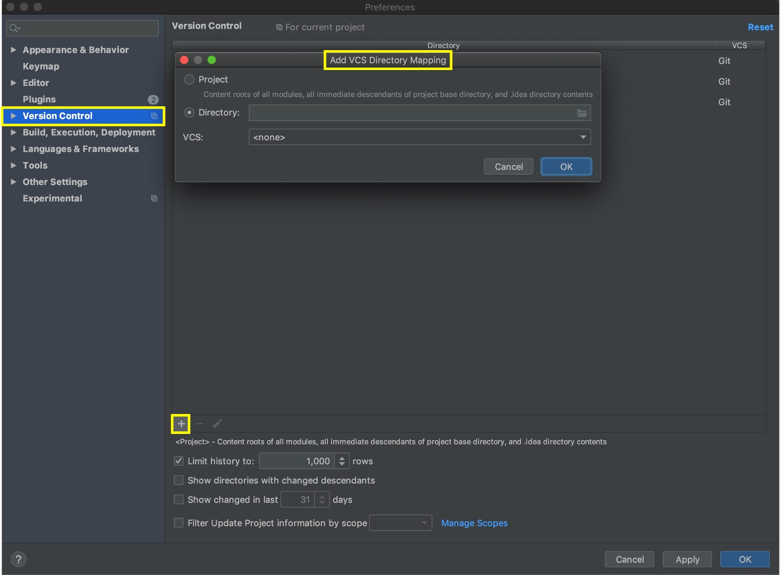 [Preferences > Version Control > + > Add VCS Directory Mapping]