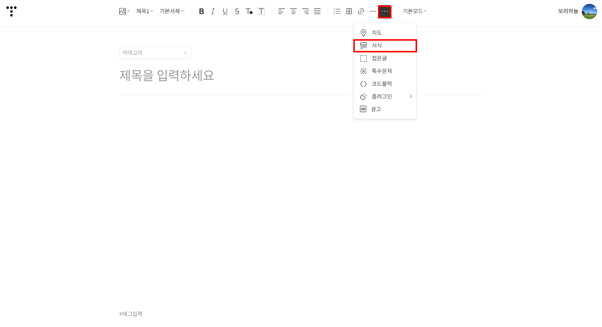 서식 불러올때에는 포스팅 화면에서 [ ... > 서식 ]에서 불러올 서식을 선택합니다.