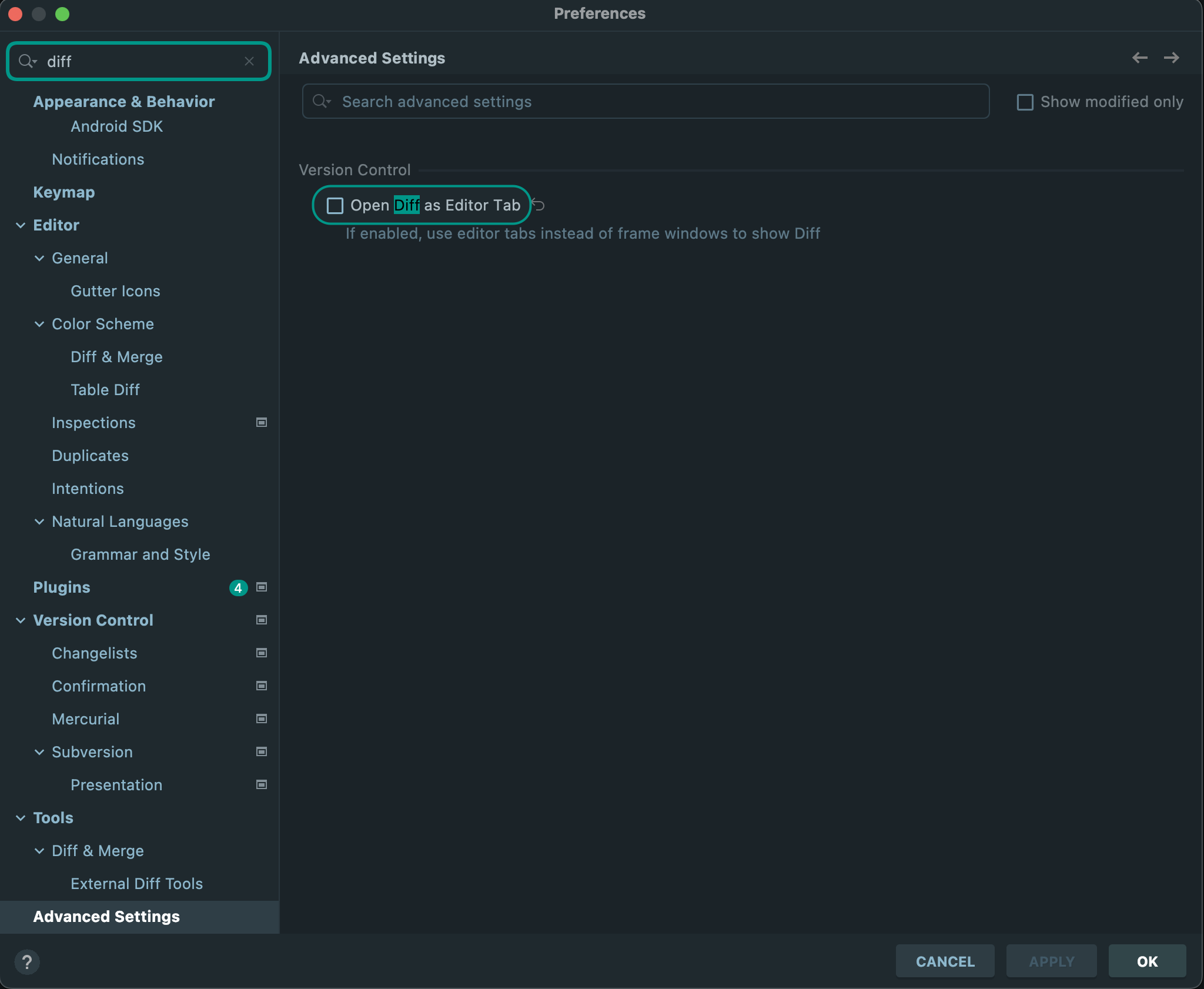 기존과 같이 새 창으로 보기 위해 Preferences 창을 열고 "diff"를 검색한다.