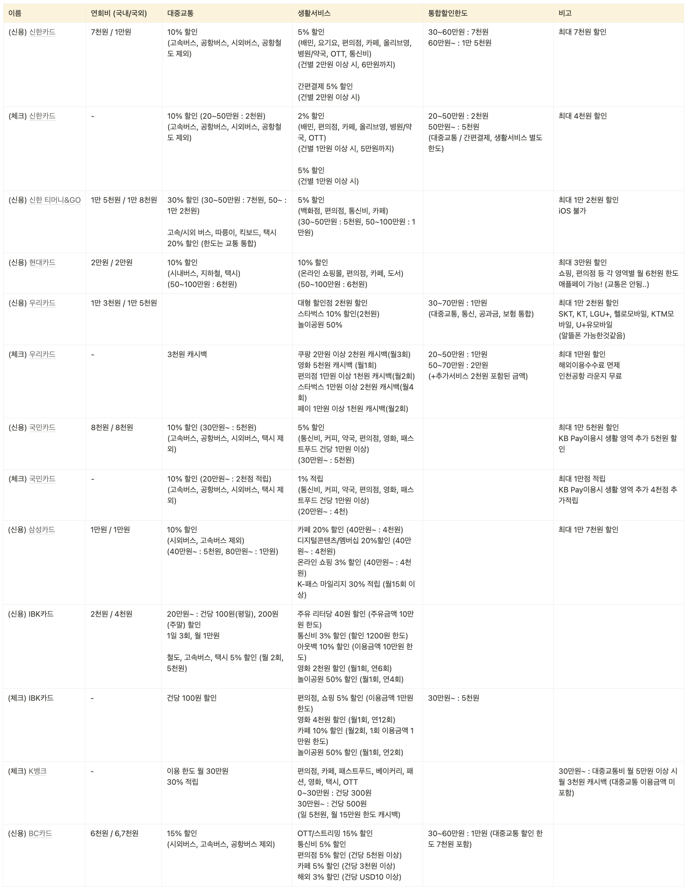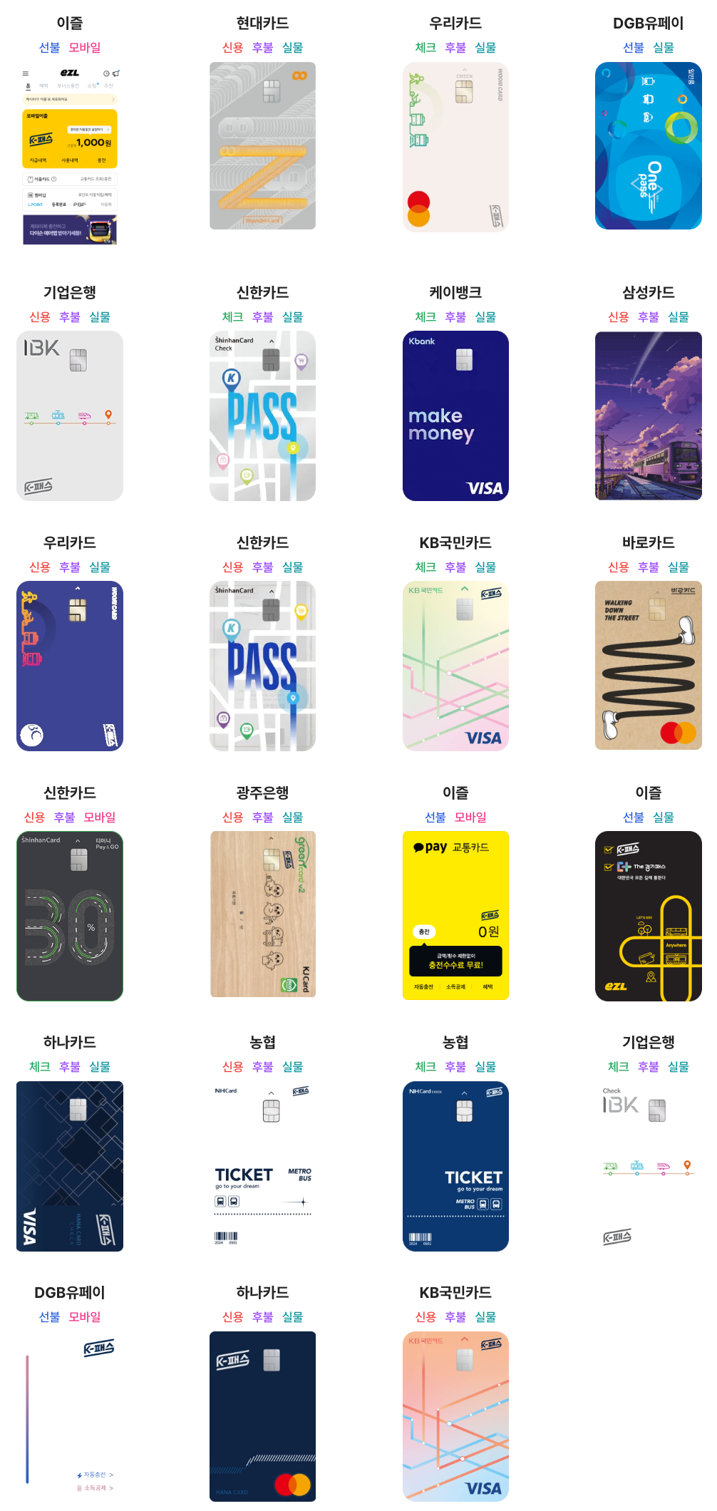 💡 K-패스 23개의 카드 중 신한카드, 신한 티머니&GO, 현대카드, 우리카드, 국민카드, 삼성카드, IBK카드, K뱅크, BC카드만 기재하였습니다.